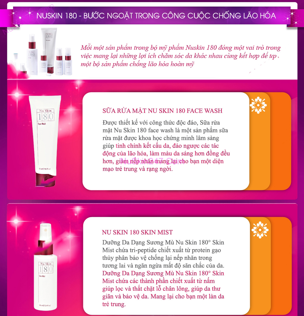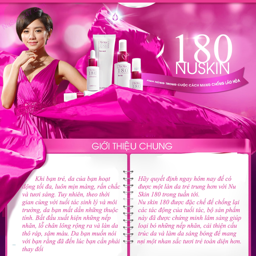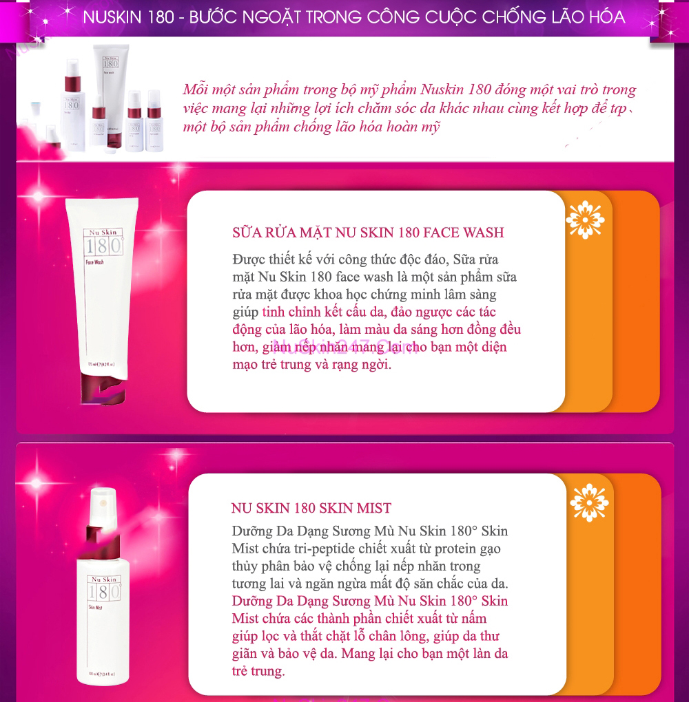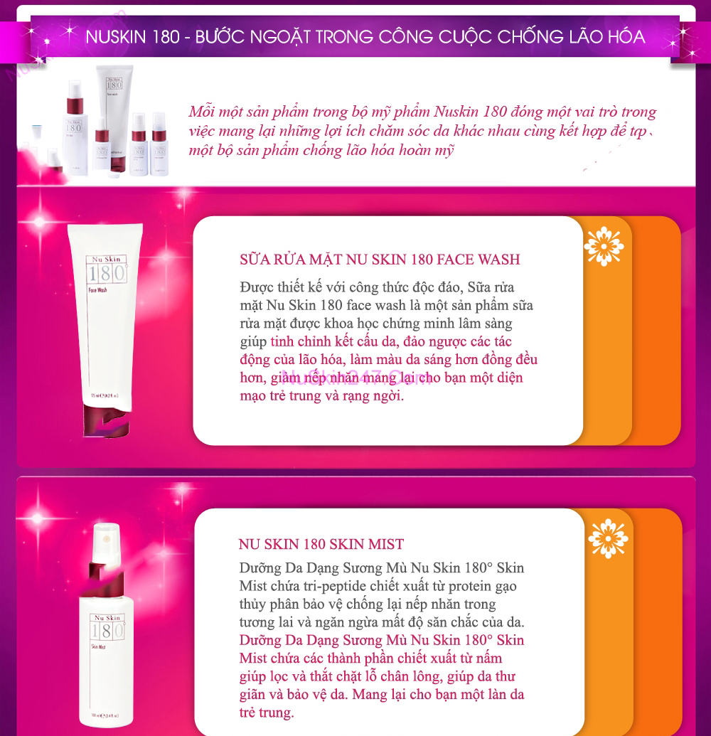 Bộ sản phẩm Nuskin 180 là bộ sản phẩm Nuskin làm mới da kết hợp năm sản phẩm mạnh mẽ với nhau, cùng hoạt động với mục tiêu làm mới da làn của bạn. Bộ sản phẩm Nuskin 180 được thiết kế nhằm đảo ngược hàng loạt các dấu hiệu da lão hóa, giảm nếp nhăn, đường nhăn mang lại cho bạn làn da trẻ trung, khỏe mạnh và rạng rỡ. Đã đến lúc mang lại một sự thay đổi thực sự cho làn da của bạn. Bộ sản phẩm Nuskin 180 là một hệ thống sản phẩm làm mới da, chống lão hóa và tái tạo tế bào của Nuskin. Bộ sản phẩm Nuskin 180 mang lại cho bạn một phương pháp chăm sóc da qua bốn bước dễ dàng, đơn giản giúp đảo ngược một loạt các tác động của quá trình lão hóa. Bộ sản phẩm Nuskin 180 được khoa học chứng minh lâm sàng giúp tinh chỉnh kết cấu da, cải thiện da tối màu, làm cho màu da trở nên đồng đều, giảm sự xuất hiện của nếp nhăn và đường nhăn mang lại cho bạn một sự xuất hiện trẻ trung hơn. Có chứa axit polyhydroxy (PHAs), bộ mỹ phẩm Nuskin 180 tẩy da chết, tế bào chết một cách nhẹ nhàng góp phần đẩy nhanh quá trình làm mới và tái tạo tế bào, tăng doanh thu tế bào – một yếu tố quan trọng trong việc duy trì làn da khỏe mạnh và trẻ trung. Các PHAs trong bộ mỹ phẩm Nuskin 180 cũng cung cấp một loạt các lợi ích chống lão hóa cho làn da bao gồm: tăng cường độ đàn hồi của da, cung cấp chất dưỡng ẩm, tăng cường bảo vệ lớp sừng, tăng cường sức đề kháng của làn da chống lại tác hại từ môi trường sống, bảo vệ là da khỏi các gốc lão hóa tự do bằng cách cung cấp các chất chống ôxy hóa mạnh mẽ.