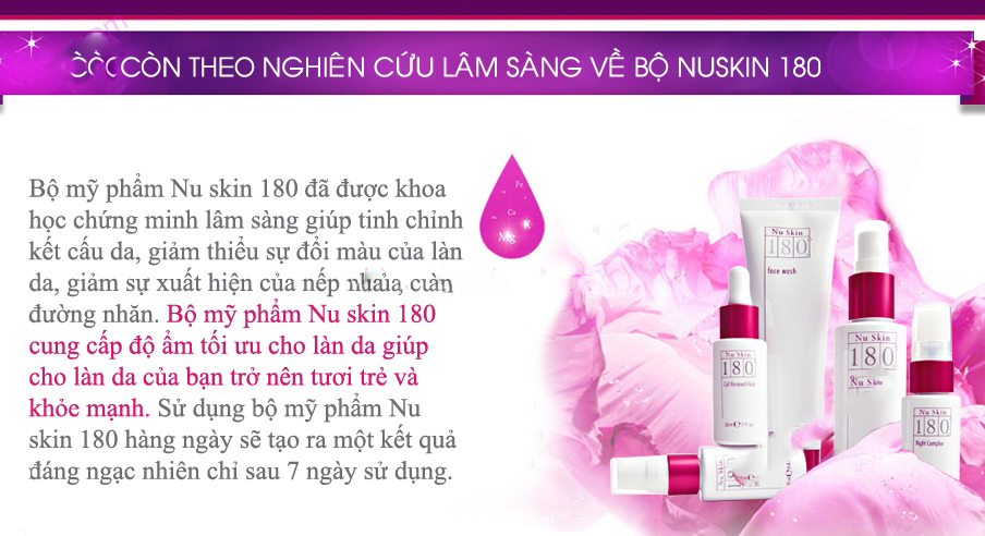 Bộ mỹ phẩm Nuskin 180 được khoa học chứng minh lâm sàng giúp tinh chỉnh kết cấu da, giảm thiểu quá trình đổi màu của làn da, giảm nếp nhăn trong khi cung cấp độ ẩm thiết yếu giúp làn da tươi trẻ và khỏe mạnh. Sử dụng bộ mỹ phẩm Nuskin 180 theo cách sử dụng khuyến cáo của Nuskin sẽ mang lại cho bạn làn da tươi trẻ chỉ sau một tuần sử dụng.
