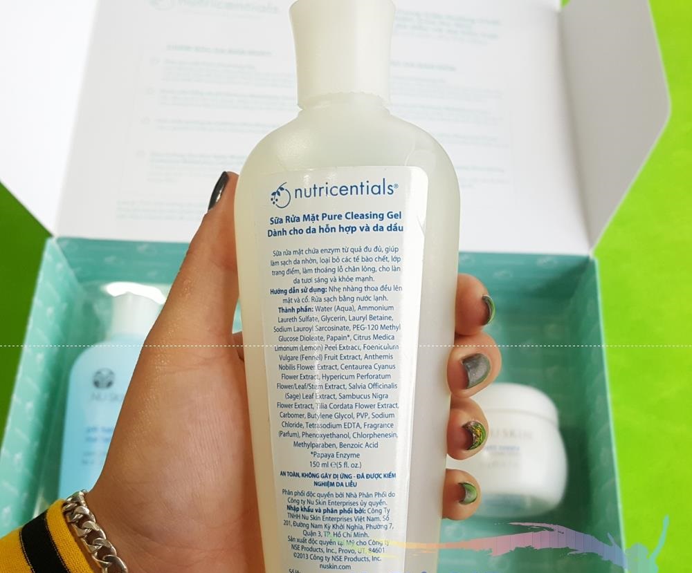 1. Sữa rửa mặt Nuskin Pure Cleansing Gel: Chứa Papain – một thành phần được chiết xuất từ trái đu đủ có tác dụng đánh bay tế bào chết, ngoài ra còn giúp tẩy trang, rửa sạch chất nhờn, làm sạch bụi bẩn bám sâu vào chân lông mang đến cho chị em phụ nữ làn da khô thoáng, giúp giảm lỗ châm lông và ngăn ngừa mụn hiệu quả.