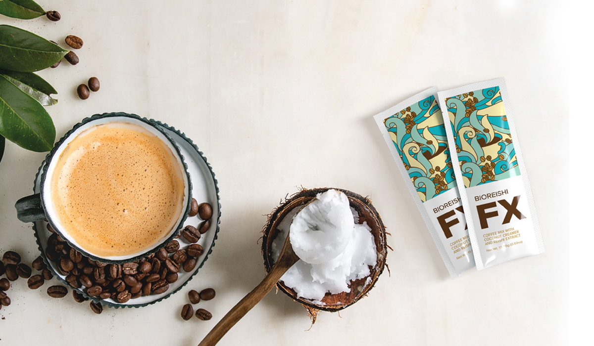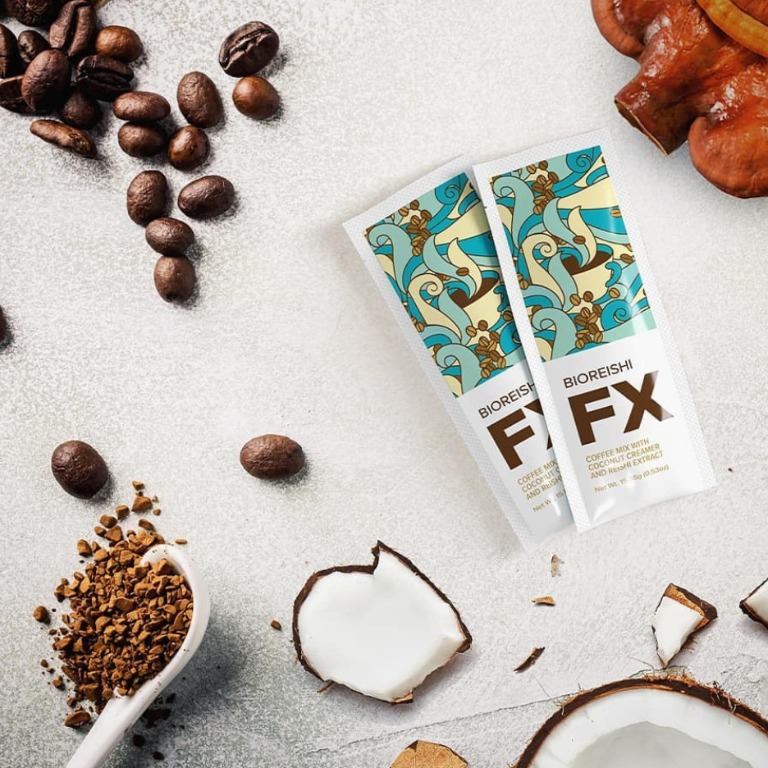 - BioReishi FX chứa công thức sáng tạo cùng nấm linh chi và kem dừa, đặc biệt không đường. Sự kết hợp giữa cà phê hảo hạng cùng kem dừa mịn, giữa một lượng caffeine tự nhiên và chất béo lành mạnh, không chỉ tạo ra hương cafe thơm quyến rũ và vị kem đậm đà khó cưỡng, mà còn giúp chống oxy hóa và là nguồn bổ sung năng lượng mạnh mẽ, liên tục và bền vững cho cơ thể.