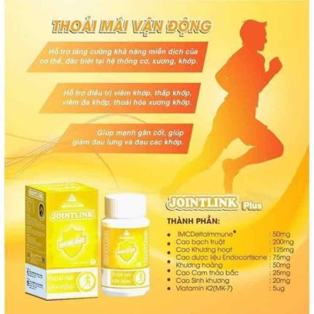 – Với hoạt chất sinh học đặc biệt Delta Immune – Vacxin thế hệ thứ 4 và cao dược liệu Endocortisone được bào chế từ Cao Rễ mướp với Cao Nhân sâm Ấn Độ cùng các vị thuốc nam khác, Jointlink Plus giúp tăng cường khả năng miễn dịch, kích thích cơ thể sản sinh Corticoid nội sinh, có tác dụng rất tốt trong việc tăng cường cũng như hỗ trợ điều trị các bệnh về xương khớp, đặc biệt đây là sản phẩm có nguồn gốc thiên nhiên không gây ra tác dụng phụ như các thuốc đặc trị khác.