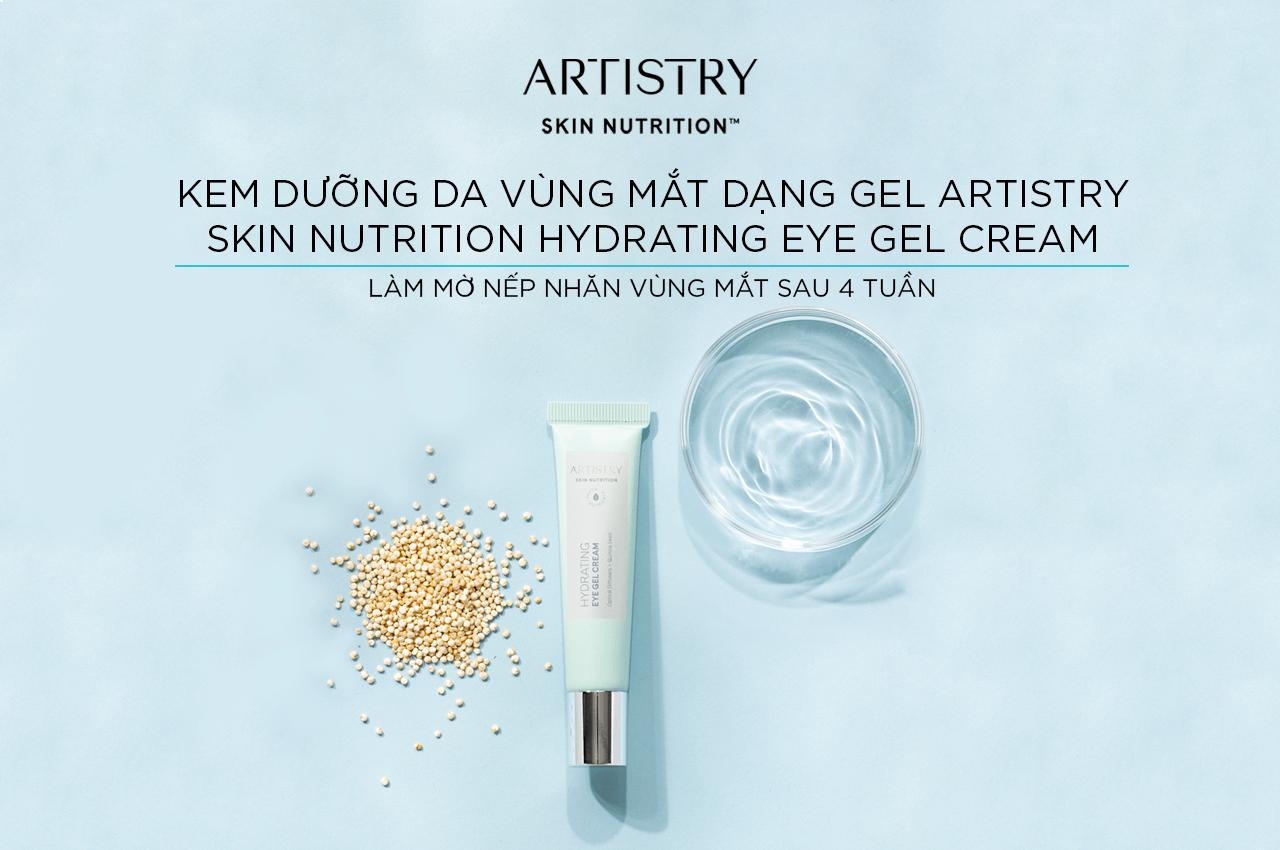 Kem dưỡng da vùng mắt dạng gel Artistry Skin Nutrition Hydrating Eye Gel Cream kết hợp giữa chiết xuất quả Lựu Đỏ có khả năng chống ô-xy hóa và làm dịu da, và chiết xuất hạt Quinoa (Diêm Mạch), kem dưỡng mắt sẽ giúp làm giảm đáng kể sự xuất hiện của quầng thâm mắt, đồng thời nuôi dưỡng và giữ ẩm cho vùng da mắt. Sản phẩm còn chứa các hạt khuếch tán siêu nhỏ Optical Diffusers giúp mắt trông bớt mệt mỏi và sảng khoái hơn.